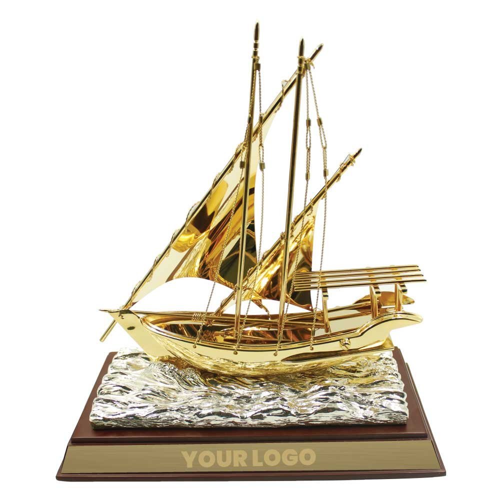 For ceremonies and other promotional events, business presents are quite important. This trophy is made of gold, making it a great present option. Unbeatable is the swag of the golden ship lying on a silver foundation. The attractive trophy includes a wooden box. The vivid color is complemented by the white satin lining of the gift box. This dhow trophy will leave a lasting impression whether you give it as a promotional award or a business gift.